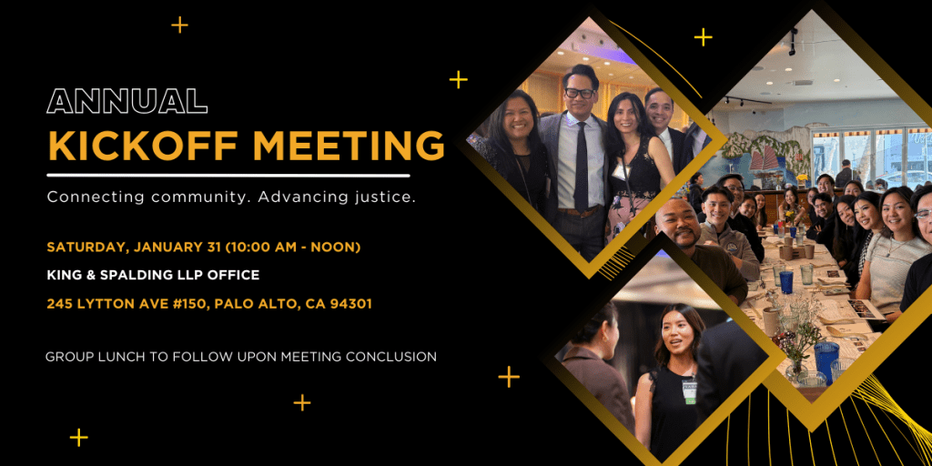 We welcome you to join our Annual Kickoff Meeting on Saturday, January 31 at 10:00 AM to 12:00 PM at King & Spalding LLP (245 Lytton Ave #150, Palo Alto, CA 94301). Get to know our Executive Board, meet current members, and become involved with one of our nine committees.