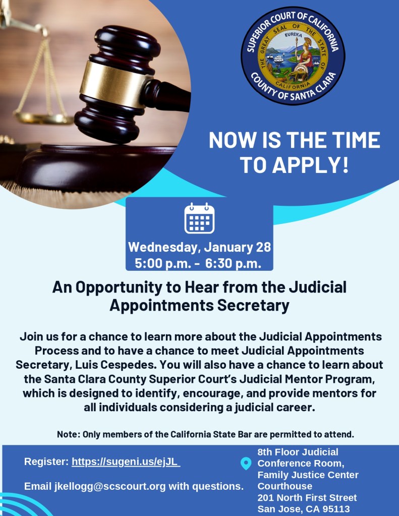 The Superior Court of California, County of Santa Clara is recruiting qualified applicants for the 2026-2027 Santa Clara County Civil Grand Jury. Applications are due March 27, 2026, by 5:00 PM, for the one-year term commencing July 1, 2026. To learn more, click here.