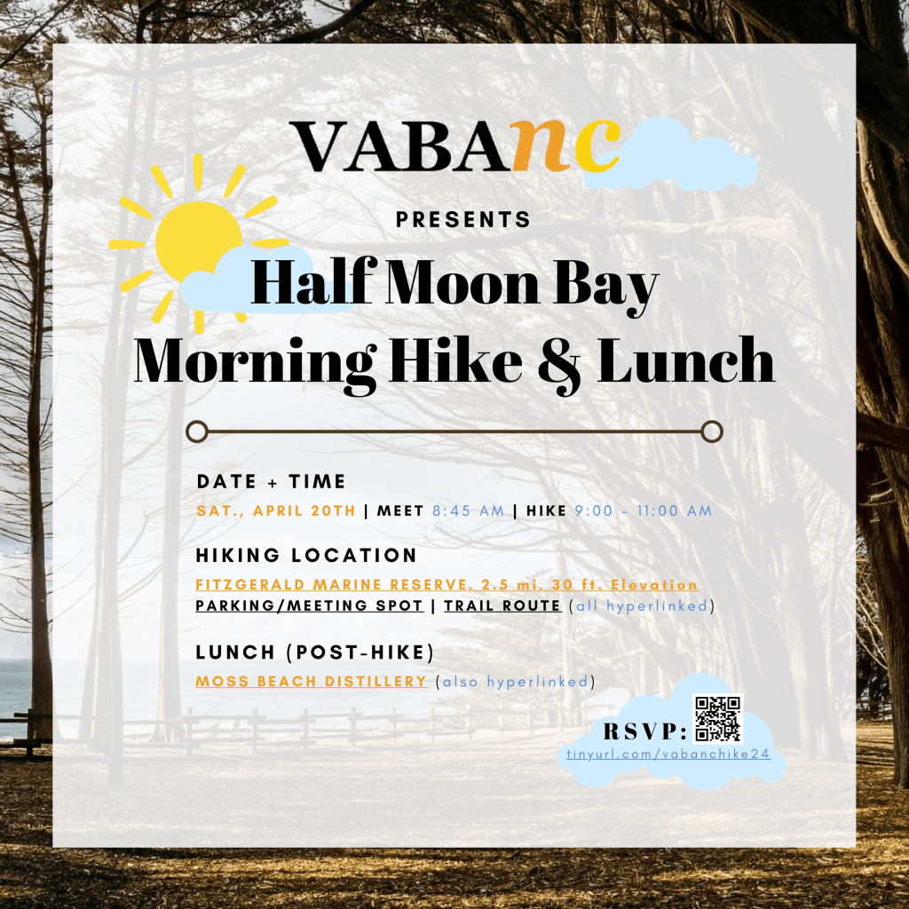 Join us on Saturday, April 20 at 8:45 AM for a morning hike at the Fitzgerald Marine Reserve in Half Moon Bay! Family and dogs are allowed. RSVP at tinyurl.com/vabanchike24. After the hike, we’ll grab lunch at the Moss Beach Distillery. Reach out to president@vabanc.org for any questions!