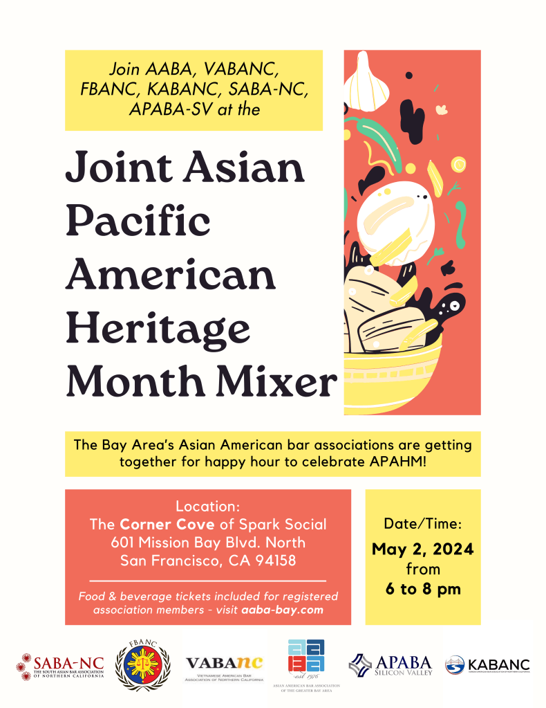 Join VABANC, AABA, APABA-SV, FBANC, KABANC and SABA-NC for the second annual joint Asian Pacific American Heritage Month Mixer on Thursday, May 2, 6-8 pm. Register here as a VABANC member. Each registered attendee will receive $30 in tickets that can be used for food and drinks at Spark Social. Hope to see you there!