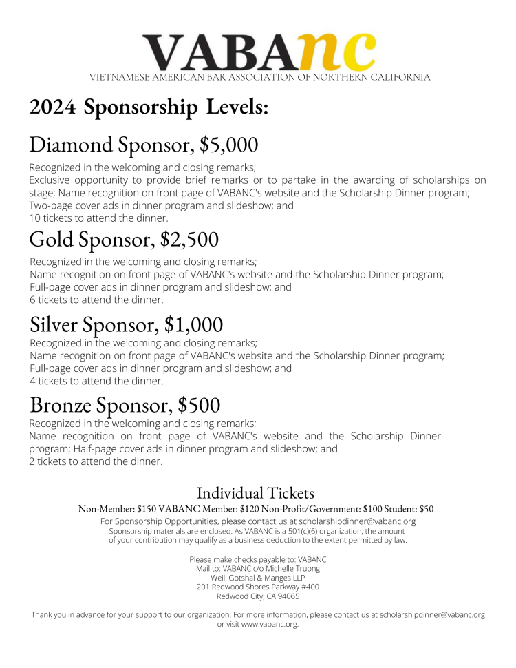 VABANC’s 26th Annual Scholarship Dinner is happening on Friday, October 4, 2024 in the Rotunda at San Jose City Hall! Purchase your ticket here.