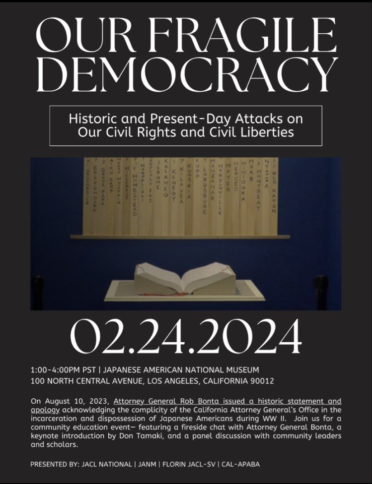 On February 24, 2024 at 1:00 PM at the Japanese American National Museum in Los Angeles, Attorney General Rob Bonta will participate in the community education event “Our Fragile Democracy: Historic and Present-Day Attacks on Our Civil Rights and Civil Liberties.”