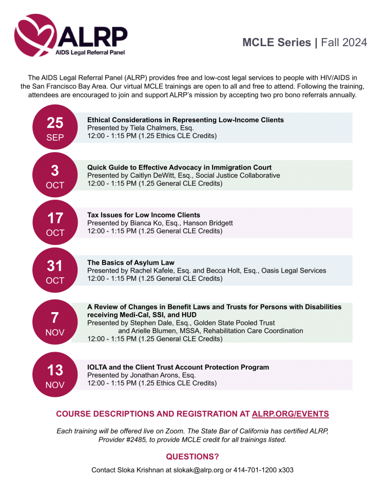 The AIDS Legal Referral Panel (ALRP) provides free and low-cost legal services to people with HIV/AIDS in the San Francisco Bay Area. Their virtual Zoom MCLE trainings are open to all and free to attend. Following the training, attendees are encouraged to join and support ALRP’s mission by accepting two pro bono referrals annually.