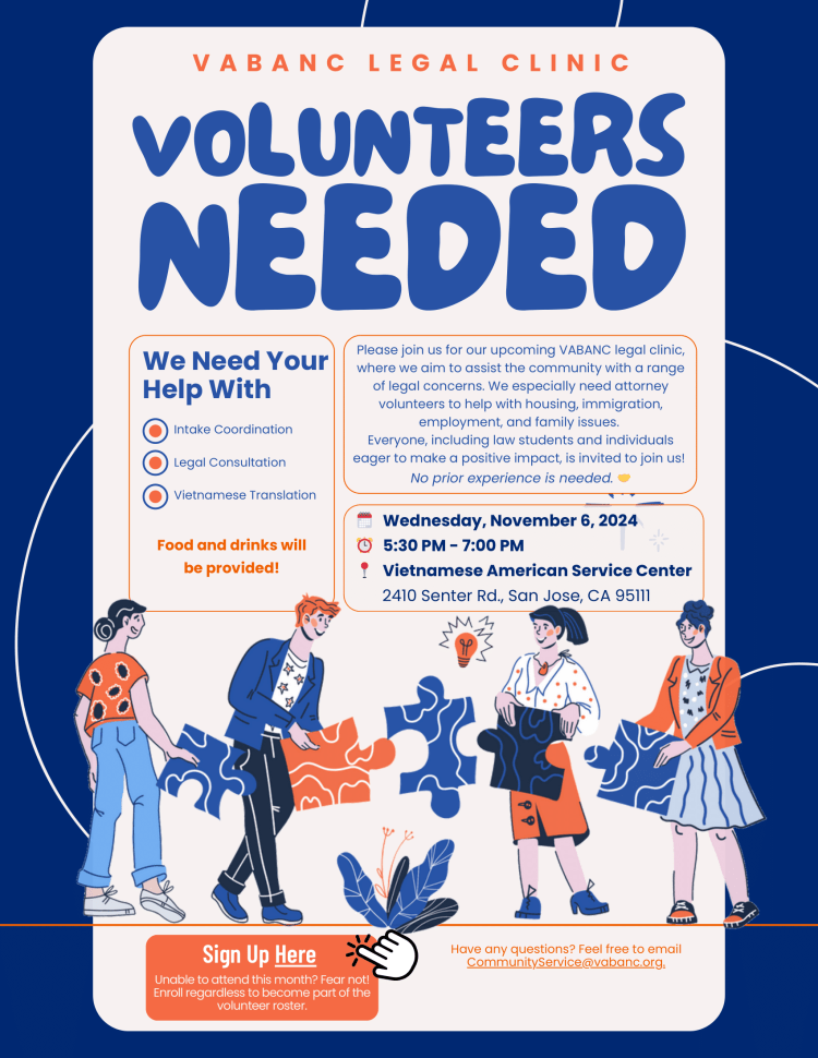 Every first Wednesday evening of the month, VABANC Legal Clinic is hosted from 5:30 PM to 7:00 PM at the Vietnamese American Service Center (2410 Senter Rd., San Jose, CA 95111), fully operated by volunteer availability. Our next clinic is on Wednesday, November 6.