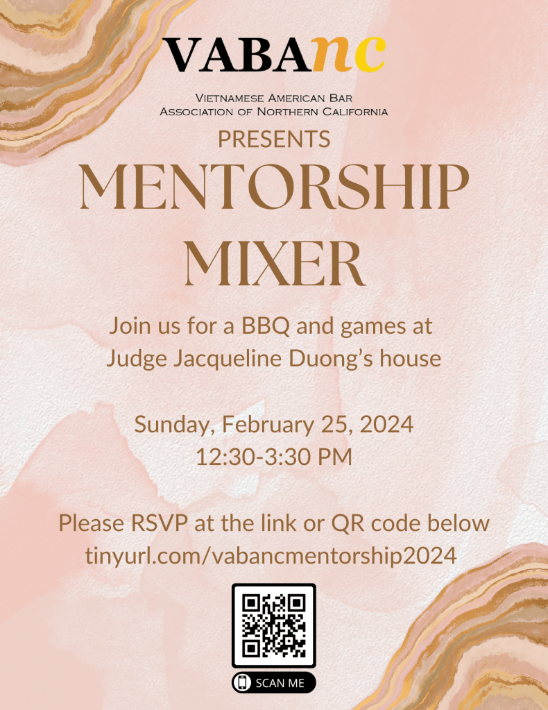 Join VABANC for our Mentorship Mixer hosted by The Honorable Judge Jacqueline Duong on Sunday, February 25 from 12:30 to 3:30 PM.